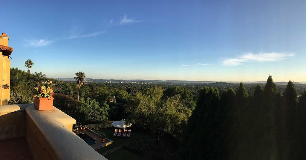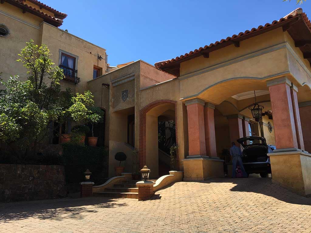 Nog geen half uur later rolt ons Japans excuus voor een SUV een van de dure welstandswijken van Pretoria binnen. Waterkloof Ridge of Waterkloof Rand is een voorstadje dat tegen de heuvels aan is gebouwd. Hier ergens moet een majestueuze Italiaanse villa staan die ons eerste onderkomen gaat verzorgen. Het blijkt meer een kasteel in Toscaanse stijl en in no-time waan ik mezelf een soort Disney prinses dat statig de imposante trap op schrijdt en me verhef boven het volk. Eenmaal op de kamer treden we door de openslaande balkondeuren en staan vanuit een van de grootse terrassen de verte in te kijken naar de fonkelende lichtjes van Pretoria. Van hieruit valt best te regeren.